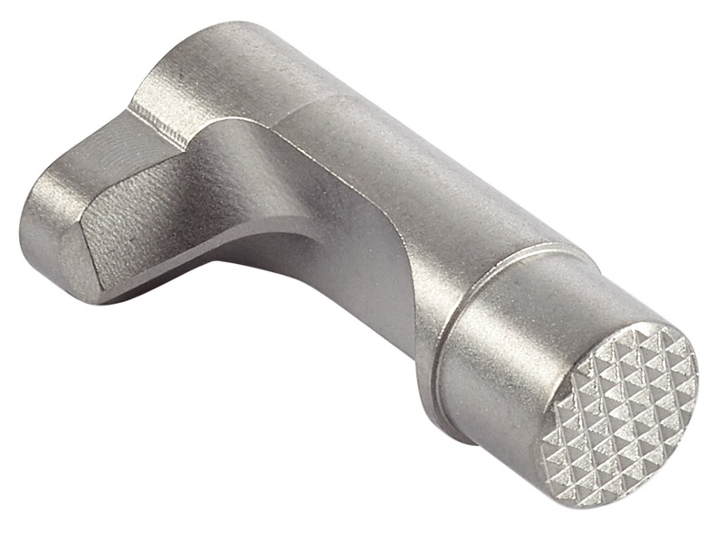 Wilson Combat 1911 Bullet Proof Magazine Release in silver steel construction. This replacement magazine release is designed for 1911 platform handguns and measures 4.7" x 3.0" x 0.2". A durable steel component for tactical and duty applications.