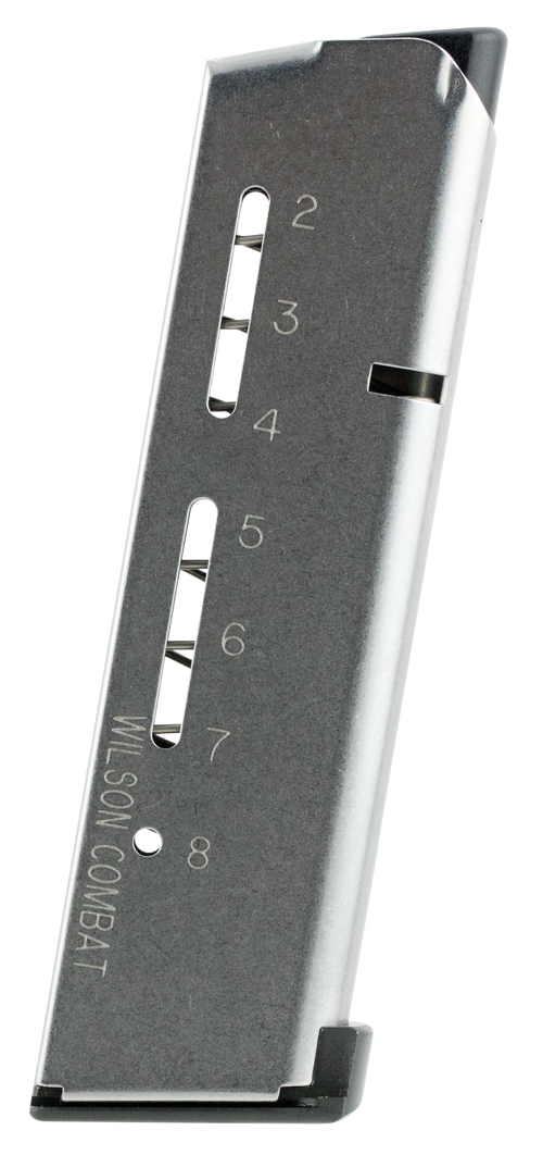 Wilson Combat 500BC ETM detachable magazine chambered in 45 ACP with 8-round capacity. Features a low-profile steel floor plate and stainless steel construction, designed specifically for Wilson Combat 1911 Elite Tactical pistols.