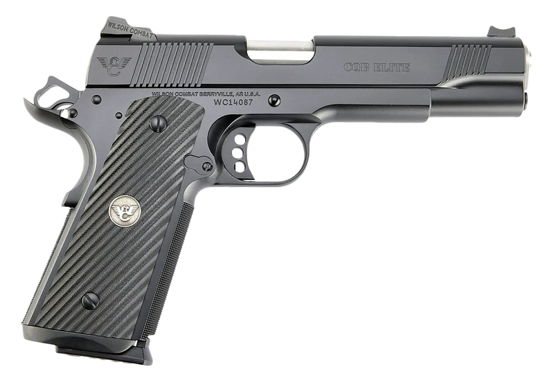 The Wilson Combat CQB Elite is a 1911-style semi-automatic pistol chambered in .45 ACP with a 5" hand-fit match-grade barrel and 8+1 round capacity. It features Black Armor-Tuff finish, G10 diagonal flat grips, fixed battlesight with fiber optic front sight, and front cocking serrations. The pistol weighs 41 oz. and measures 8.7" overall length.