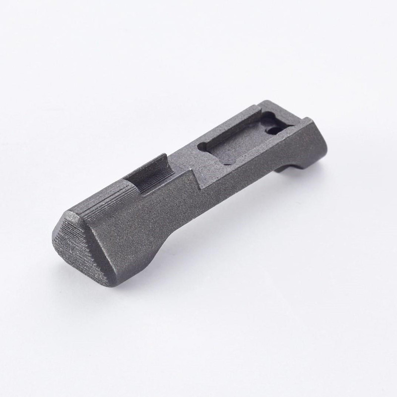 This extended magazine catch for the Sig Sauer P320 provides a slightly larger release button for faster, more reliable magazine changes compared to the factory low-profile design. Precision machined from stainless steel with black nitride finish, it features an angled ergonomic surface and drop-in installation. The durable construction is engineered to withstand thousands of reload cycles without wear.