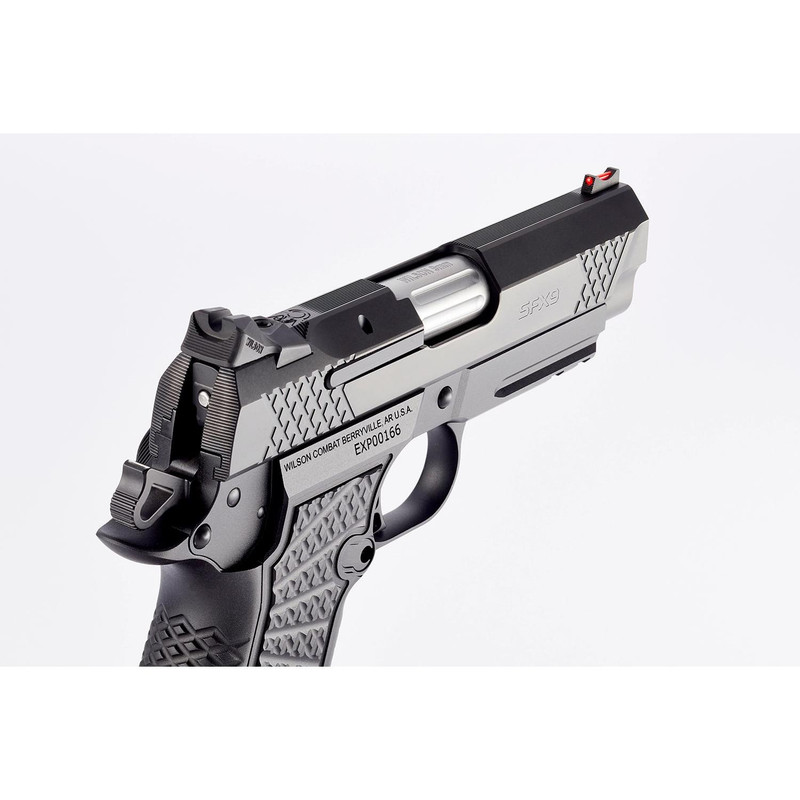 The Wilson Combat SFX9 is a semi-automatic compact handgun chambered in 9mm Luger with a 4" stainless steel barrel and 15-round capacity. Features include an aluminum X-Frame with X-TAC frontstrap/backstrap treatment, adjustable fiber optic sights, ambidextrous thumb safety, and Bullet Proof components. Includes two 15-round magazines and ships with next-day or second-day air delivery options.