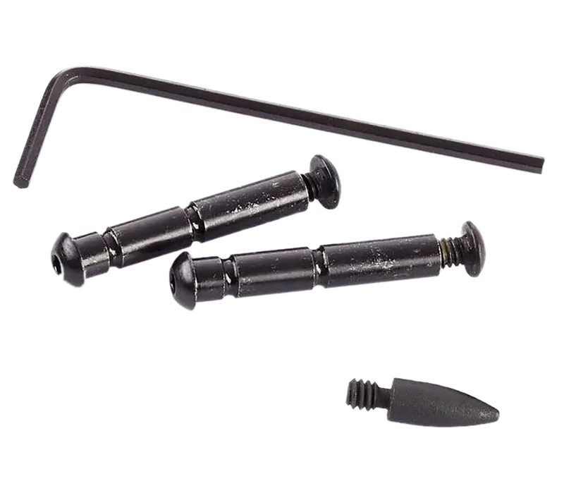 Stainless steel hammer and trigger pin set designed for AR-15 and AR-10 platforms featuring anti-walk design to prevent pin migration. This accessory is compatible with both rifles and handguns and provides a reliable upgrade to standard pins. Dimensions: 4.6" length x 3.1" width x 1.2" height.