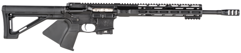 Semi-auto tactical rifle chambered in 300 Blackout with a 16.25" match grade stainless steel barrel and 10+1 capacity. Features a fixed Magpul MOE carbine stock, Strike Industries featureless grip for CA compliance, and TacFire muzzle brake. Weighs 6.12 lbs with an overall length of 35".