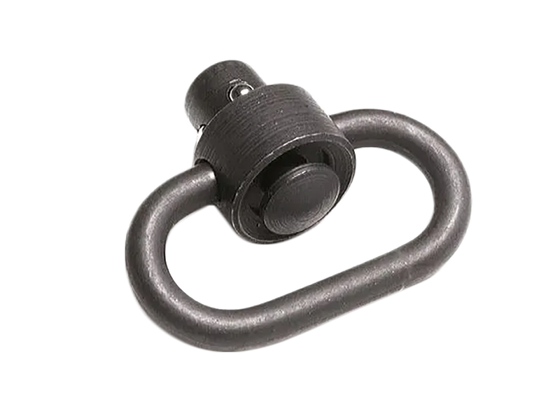 Heavy duty push button quick detach swivel designed for mounting slings to rifles and shotguns. Features black phosphate finish steel construction with a 1.25" loop size and durable quick detach mechanism. Dimensions are 4.5" length x 3.0" width x 0.5" height.