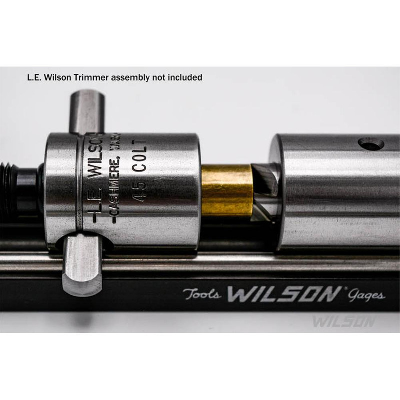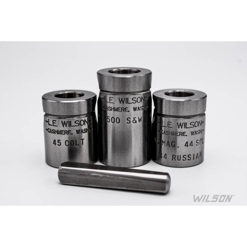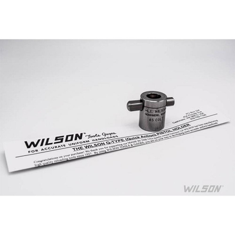 Q-Type case holder designed for use with L.E. Wilson case trimmers, compatible with .44 Mag, .44 Special, and .44 Russian calibers. Features a cross-pin design for easy case positioning without requiring the tapping method needed for standard pistol case holders. Includes 1-year manufacturer's limited warranty.