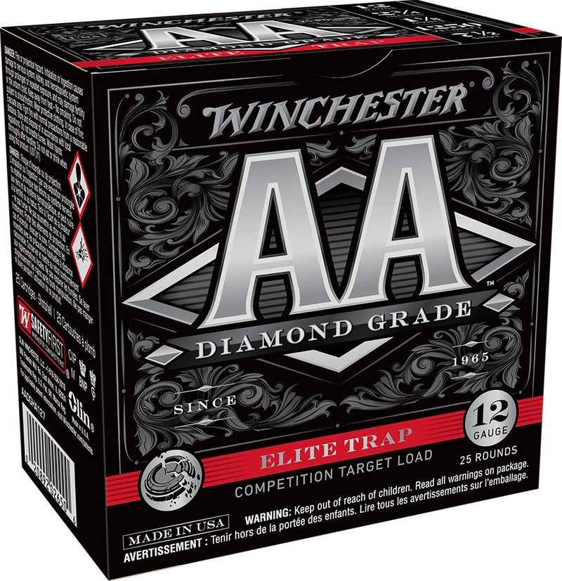 Winchester AA Diamond Grade Elite Trap shotshells are designed for accomplished trap shooters and ATA sanctioned competitions. Loaded with high antimony lead shot precision sorted for maximum hardness and consistent patterns, these 12 gauge 2.75" shells deliver 1 1/8 oz of #7.5 shot at 1250 fps from a plastic casing.