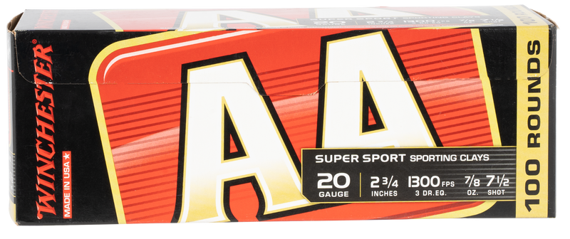 Winchester AA Sporting Clay shotshells in 20 gauge, 2.75" case length, loaded with 7/8 oz of #7.5 shot. These target-oriented shells deliver 1300 fps velocity and feature specially designed wads to reduce felt recoil and improve pattern performance, making them ideal for clay target sports and competitive shooting.