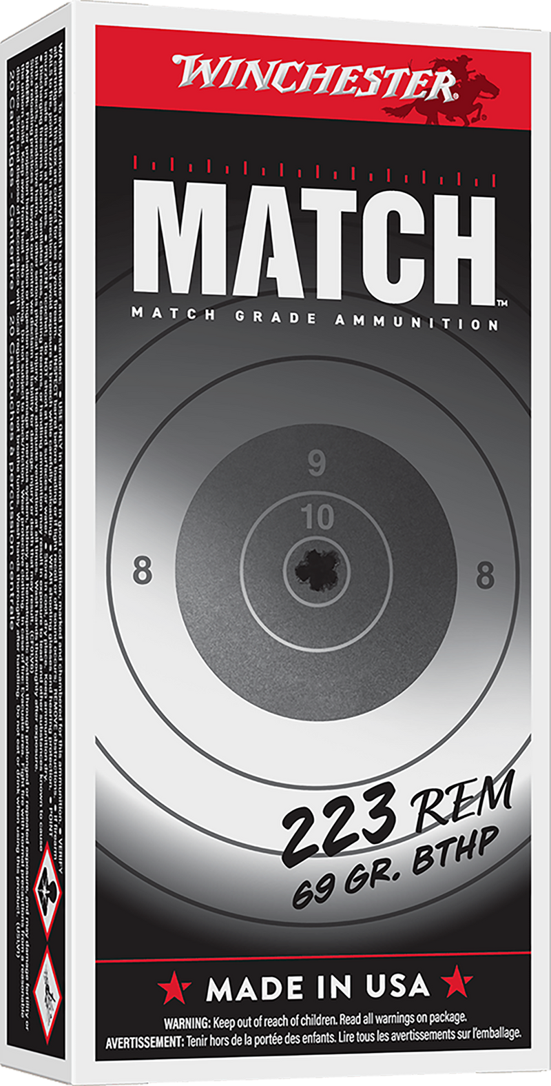 Winchester Match ammunition in 223 Rem caliber loaded with 69 grain Sierra MatchKing BTHP bullets. Delivers 3060 fps muzzle velocity and 1434 ft lbs muzzle energy, designed for precision target shooting and sport shooting applications. Brass cased ammunition packaged 20 rounds per box.