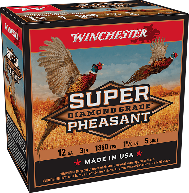 Winchester Super Pheasant Diamond Grade shotshells are loaded with 8% antimony copper-plated lead shot in #5 size, designed for hunting upland game birds like pheasants. These 12 gauge 3" shells deliver 1 5/8 ounces of shot at 1350 fps muzzle velocity for tight, consistent patterns. Each box contains 25 rounds.