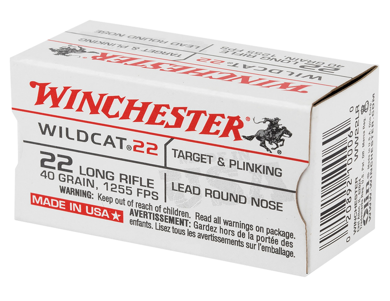 Winchester USA Wildcat .22 LR ammunition features a 40-grain lead round nose bullet and brass casing, delivering a muzzle velocity of 1255 fps. This bulk 5000-round case (10 boxes of 500) is ideal for range training, plinking, and small game hunting. Economical rimfire ammunition for high-volume shooters.