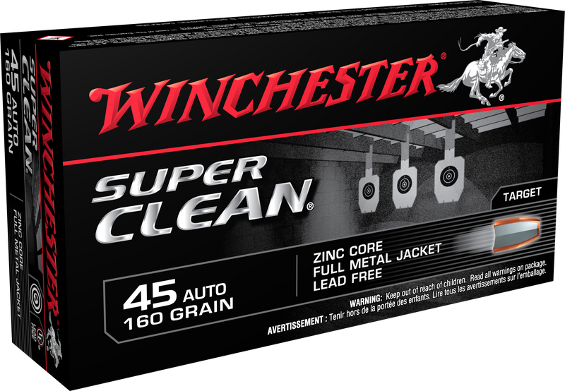 Winchester Super Clean 45 ACP ammunition features a 160-grain lead-free full metal jacket bullet with zinc core and heavy metal-free primer, delivering 1100 fps muzzle velocity and 430 ft-lbs of energy. Designed for training on both indoor and outdoor ranges with superior accuracy and reliable performance. Sold in 50-round boxes, 10 boxes per case.