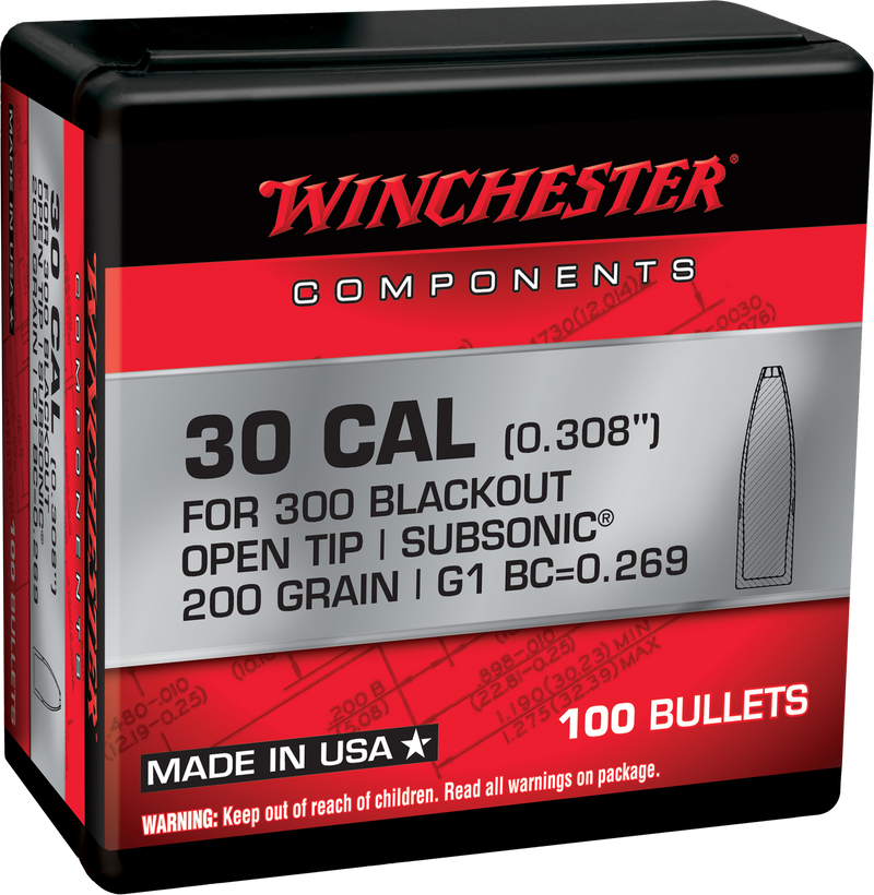 Winchester reloading bullets in 300 Blackout caliber with 200-grain weight and open tip design. These bullets are suited for precision rifle reloading and are packaged 100 per box with 10 boxes per case. Hazmat shipping applies due to ammunition classification.