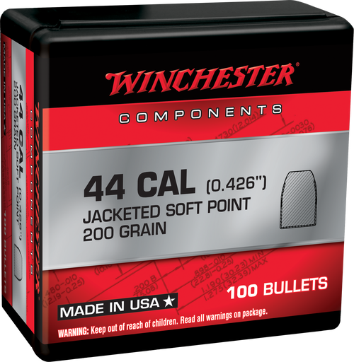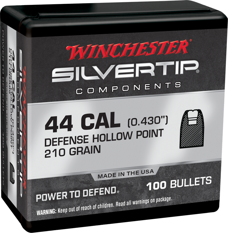 Winchester reloading bullets designed for 44 Remington Magnum handgun cartridges, featuring 210-grain Silvertip Hollow Point construction with a .430" diameter. These bullets are sold in a box of 100 and utilize a lead core for consistent ballistic performance. Ideal for handloaders seeking quality centerfire handgun ammunition components.