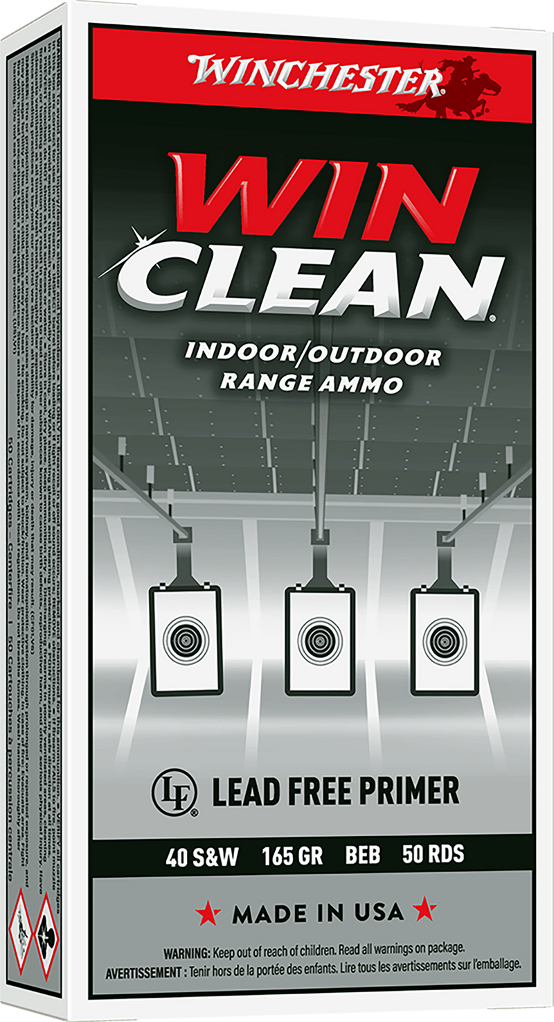 Winchester Super X 40 S&W ammunition features 165 grain Winclean brass enclosed base projectiles designed for target shooting and personal protection. This centerfire handgun ammo delivers 1130 fps muzzle velocity and 468 ft lbs of muzzle energy per round. Sold in boxes of 50 rounds with 10 boxes per case.