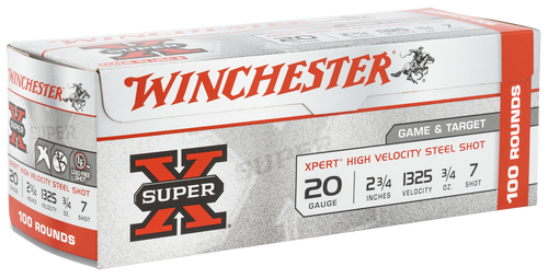 Winchester Super X Xpert High Velocity shotshell ammunition in 12 gauge with 2.75" cases loaded with 1 ounce of #7 steel shot. Designed for hunting and target shooting with a muzzle velocity of 1325 fps. Comes in a 100-round box (2 cases per value pack).