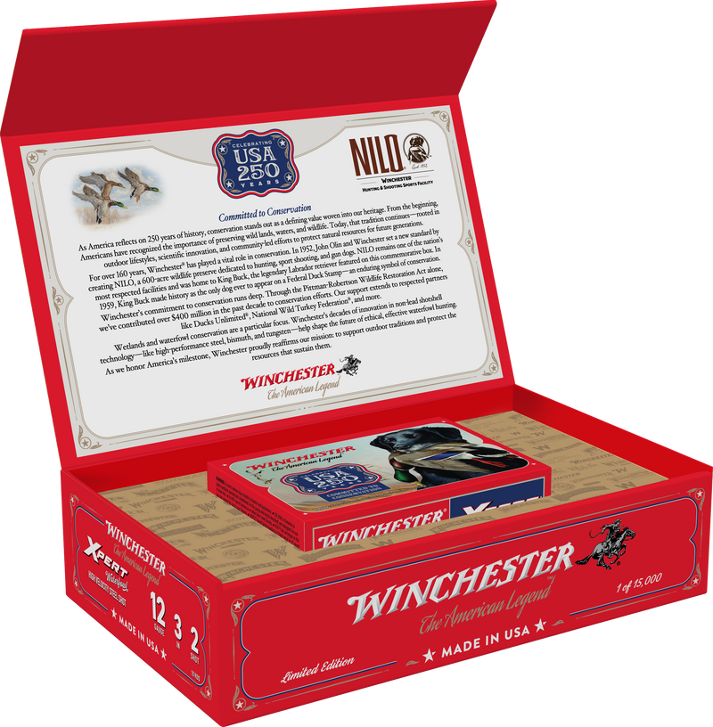 Winchester Xpert 12 Gauge shotshell ammunition in a 250th Anniversary commemorative box series. Features 2.75" shells loaded with 1-1/16 oz of #2 shot and a muzzle velocity of 1550 fps, suitable for waterfowl hunting and general shooting applications.
