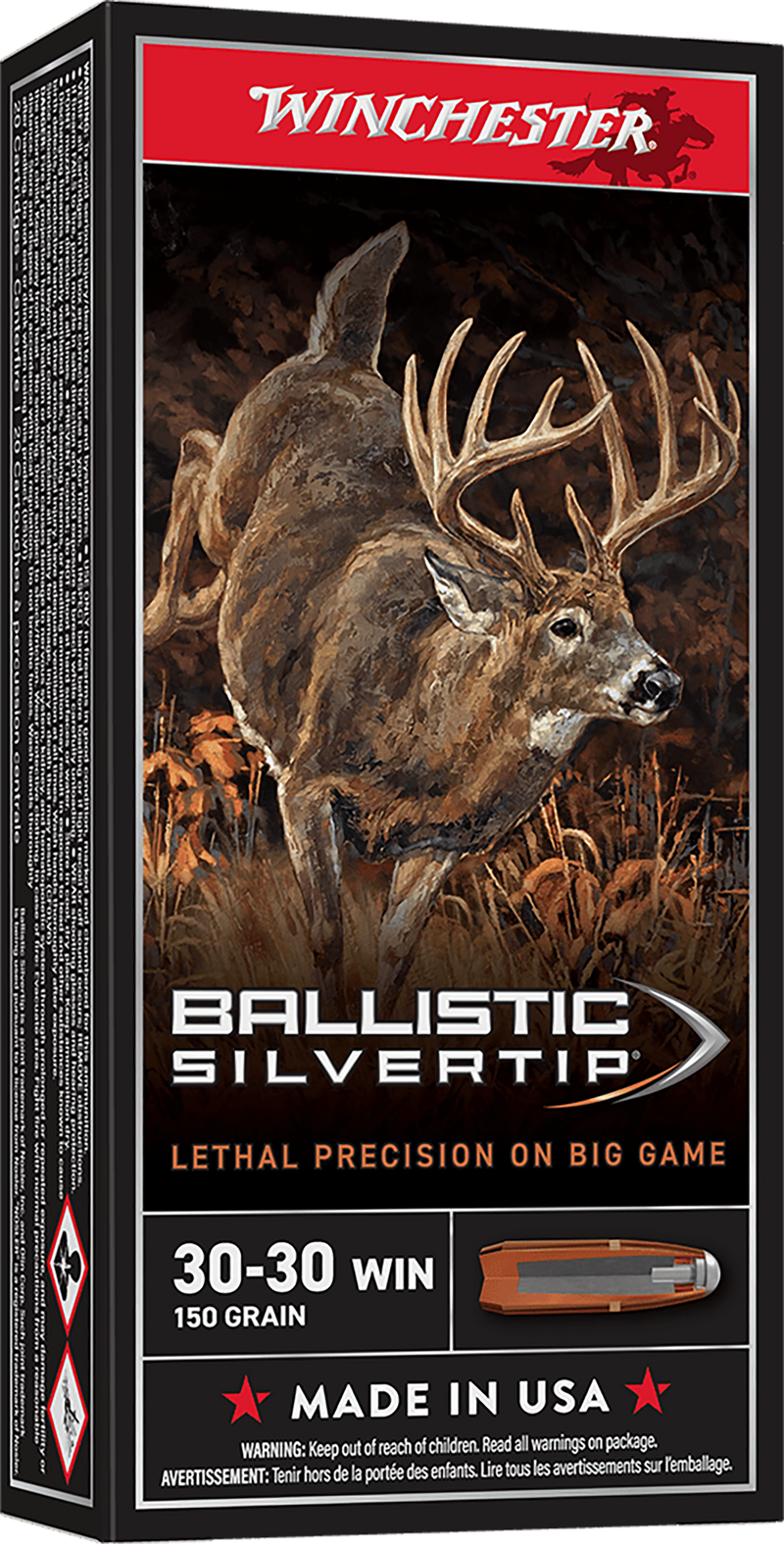 Winchester Ballistic Silvertip ammunition in 30-30 Winchester with 150 grain polymer-tipped bullets delivering 2390 fps muzzle velocity and 1902 ft-lbs of energy. The rapid controlled expansion design features a polymer tip and boat tail for long-range accuracy and deep penetration on medium-sized game. Brass cased, boxer primed, packaged 20 rounds per box.