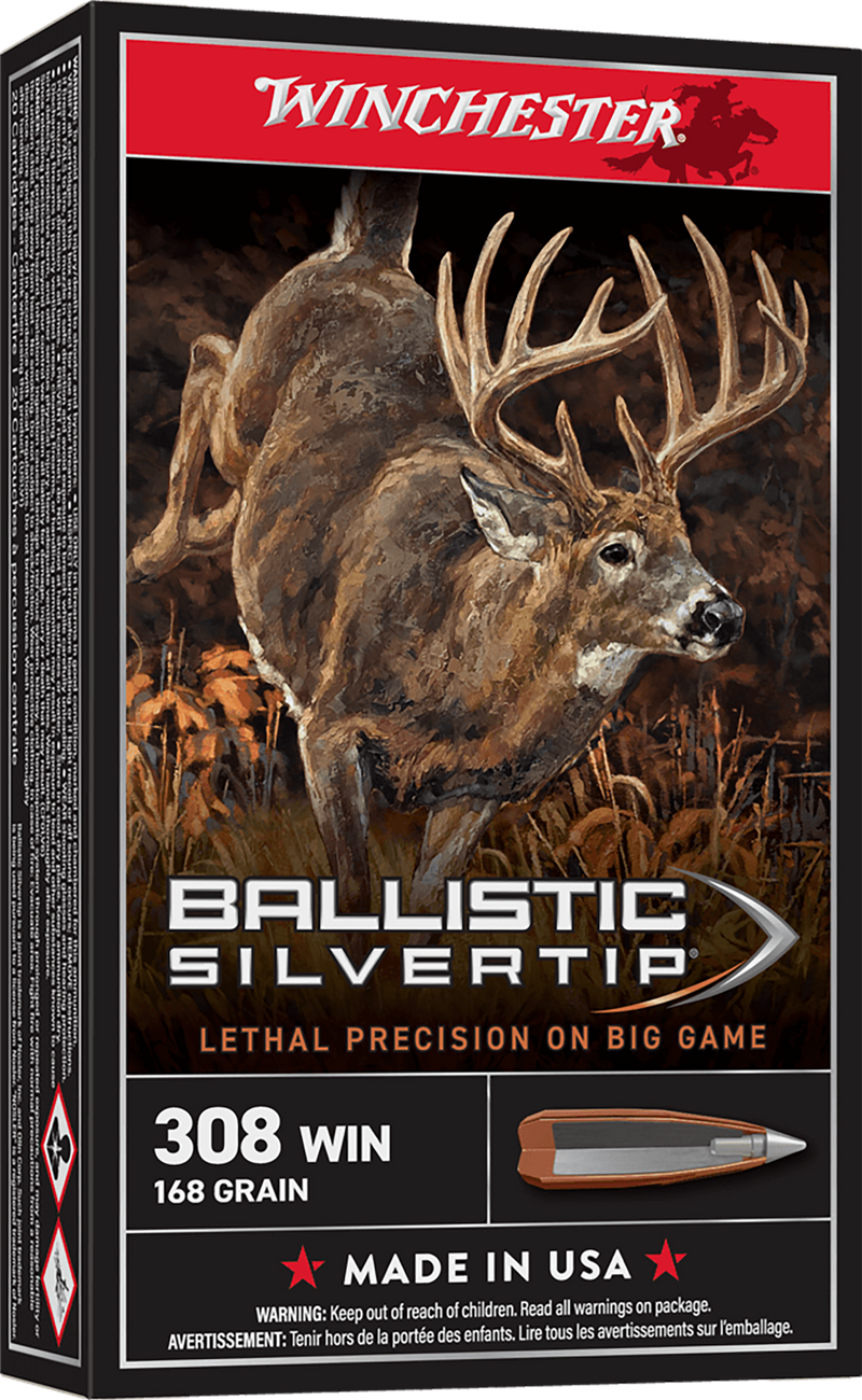 Winchester Ballistic Silvertip ammunition in .308 Winchester with 168-grain rapid controlled expansion polymer tip bullets designed for hunting and target shooting. Delivers 2670 fps muzzle velocity and 2659 ft-lbs of energy with brass cases and Boxer primers. Features a polymer tip boat tail design with lead-alloy core for weight retention and penetration.
