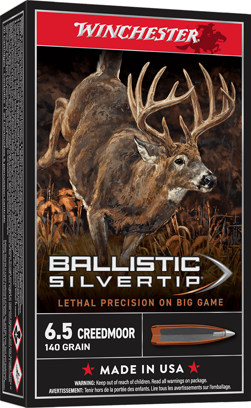 Winchester Ballistic Silvertip 6.5 Creedmoor ammunition features 140-grain rapid controlled expansion polymer-tipped bullets delivering 2700 fps muzzle velocity and 2266 ft-lbs of energy. The nickel-plated brass cases are reloadable and designed for hunters seeking proven knock-down performance and precision at extended ranges.
