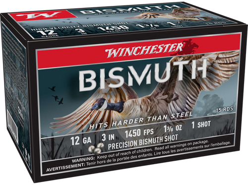 Winchester Bismuth shotshell ammunition in 12 gauge 3" magnum with 1 3/8 oz of tin-plated bismuth #1 shot. Designed for waterfowl and upland hunting with a buffered payload for improved pattern density at 60 yards, loaded to 1450 fps. Features a water-resistant lacquered primer and double seal for reliable performance in wet conditions.