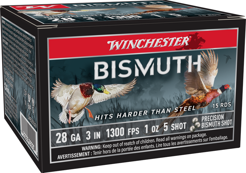 Winchester Bismuth shotshells in 28 gauge with 3" shells deliver 1 ounce of #5 bismuth shot at 1300 fps, designed specifically for waterfowl hunting. The non-toxic bismuth construction makes these compliant with regulations in sensitive areas. High brass plastic cases with Boxer primers provide reliable performance for waterfowl applications.