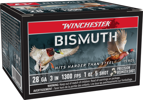 Winchester Bismuth shotshell ammunition in 410 gauge, 3" shell length, loaded with 9/16oz of #5 bismuth shot at 1300 fps. Designed for waterfowl hunting with non-toxic bismuth pellets. Boxer-primed, reloadable cases with high brass construction.