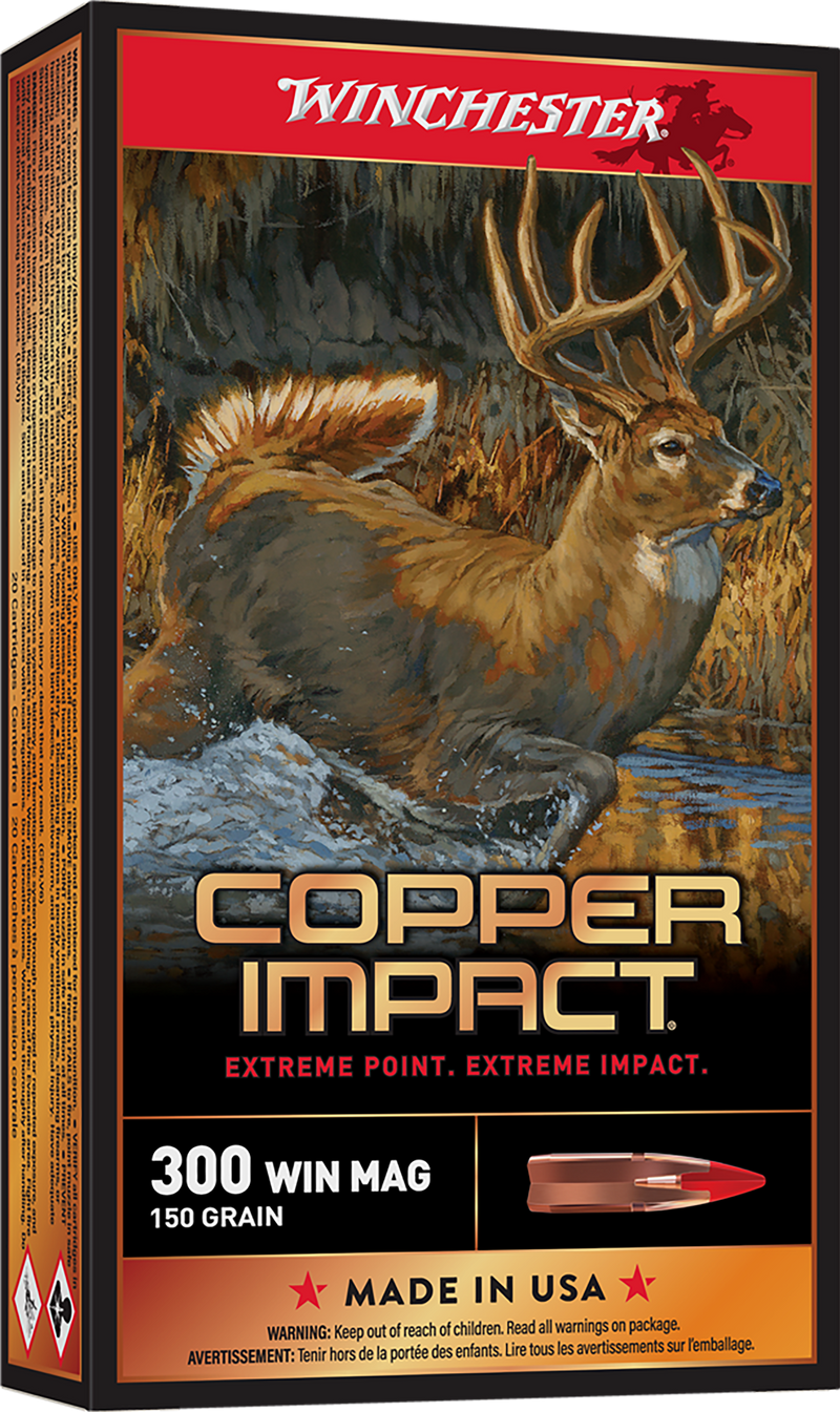 Winchester Copper Impact ammunition in 300 Winchester Magnum with 150-grain Copper Extreme Point lead-free bullets. Delivers 3260 fps muzzle velocity and 3539 ft-lbs muzzle energy with a large-diameter polymer tip designed for rapid expansion and massive knockdown power on big game. Features solid copper construction for superior weight retention and engineered boattail for improved long-range ballistics.