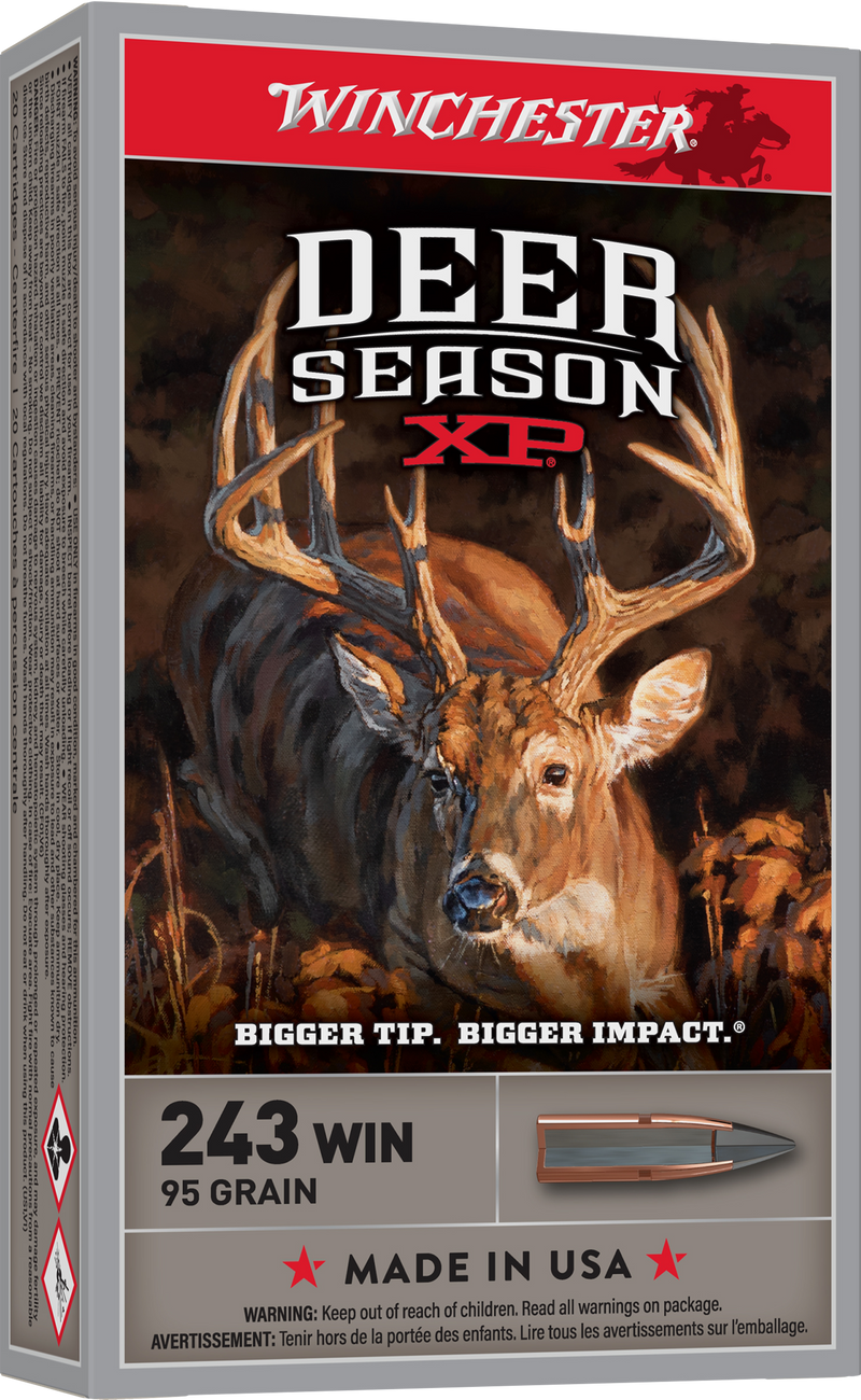 Winchester Deer Season XP ammunition in .243 Winchester features a 95 grain Extreme Point polymer tip bullet designed specifically for deer hunting. The oversized impact diameter provides superior energy transfer and knockdown with a muzzle velocity of 3100 fps and muzzle energy of 2027 ft-lbs. Comes in 20-round boxes with brass casings and Boxer primers.