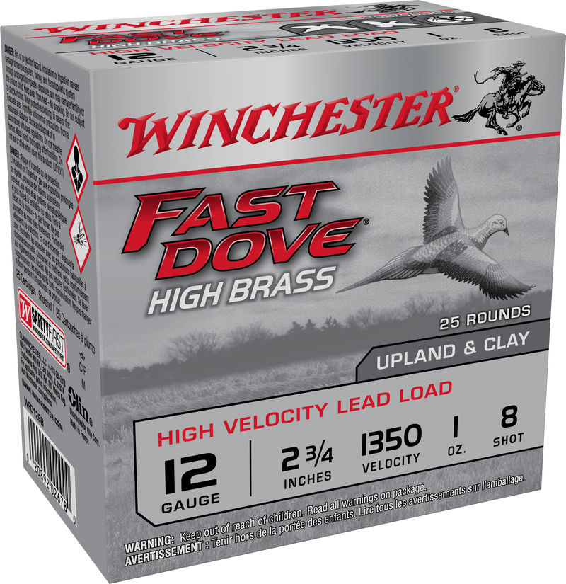 Winchester Fast Dove & Clay ammunition is a 12 gauge shotshell loaded with 1 ounce of #8 lead shot at 1350 fps, designed for dove and clay target shooting. The high brass construction provides reliable feeding and extraction. This ammunition is ideal for hunting and sport shooting applications.