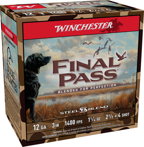 Winchester Final Pass 12 Gauge 3" shotshells feature a custom blend of plated precision steel shot in #BB and #1.5 sizes with 1 1/4oz payload traveling at 1400 fps. These waterfowl loads utilize a double seal wad system and lacquered primer for maximum water resistance and pattern density. Designed for hunting waterfowl in harsh conditions with balanced penetration and increased pellet counts.
