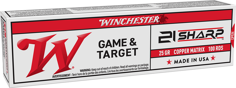 Winchester 21 Sharp ammunition features a 25-grain copper matrix bullet designed for superior accuracy in rimfire applications. This lead-free, high-velocity round (1750 fps) is suitable for target shooting and small game hunting, offering the ability to utilize bullet types not commonly found in standard .22 Long Rifle.