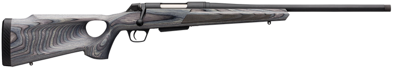 Winchester XPR Thumbhole Varmint SR bolt-action rifle in 243 Win with 24" free-floating button-rifled barrel and M.O.A. trigger system. Features gray laminate thumbhole stock with raised cheekpiece, threaded muzzle, and drilled/tapped receiver for scope mounting. Weighs 8 lbs with 3+1 capacity and two-position safety.