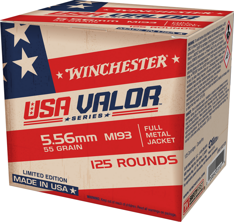 Winchester USA Valor M193 ammunition in 5.56x45mm NATO features a 55 grain full metal jacket bullet with a muzzle velocity of 3,270 fps and muzzle energy of 1,306 ft-lbs. This new production, non-corrosive ammunition is loaded in reloadable brass cases and is ideal for target shooting, training, and range use.