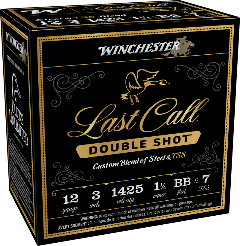 Winchester Last Call Double Shot pairs high-density tungsten-supershot (TSS) with precision plated steel shot in a 12 gauge 3" magnum load rated at 1425 fps. This ultra high-performance hunting round delivers 1 1/4 oz of BB and #7 shot, designed for waterfowl and upland game hunting with reduced lead shot.