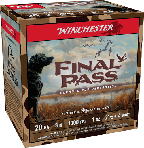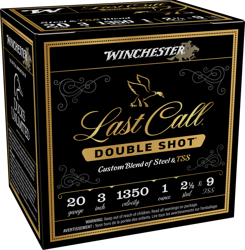 Winchester Last Call Double Shot pairs high-density TSS shot with precision plated steel shot in a 20 gauge, 3" shell loaded with 1oz of #2.5 and #9 shot. This ultra high-performance hunting load delivers 1350 fps muzzle velocity with improved pellet counts (~170 total pellets) for tighter patterns and deeper penetration on waterfowl and upland game.