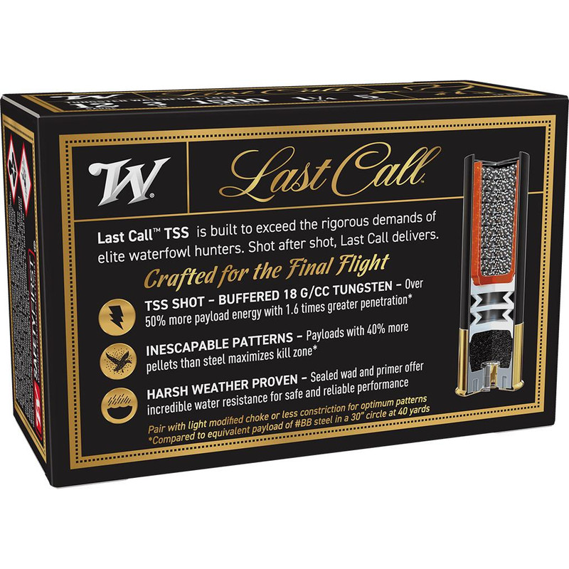 Winchester Last Call TSS waterfowl shotshells are loaded with buffered 18 G/CC tungsten shot in #5 size, delivering over 50% more payload energy and 1.8x greater penetration compared to steel. Designed for elite waterfowl hunters, these 3" shells load 1-1/4oz of shot at 1500 fps in plastic cases with sealed primers for excellent water resistance and harsh weather performance.