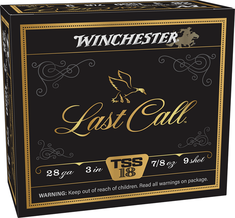 Winchester Last Call TSS shotshells in 28 gauge, 3" magnum length, loaded with 7/8 oz of #9 tungsten shot at 1550 fps. Designed for elite waterfowl hunting with buffered 18 G/CC tungsten that delivers over 50% more payload energy and 1.8x greater penetration compared to steel, featuring sealed wad and primer for weather resistance.