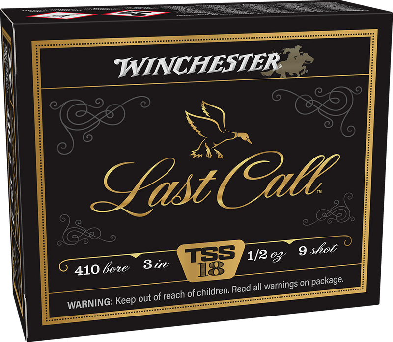 Winchester Last Call TSS shotshells are designed for waterfowl hunting with tungsten super shot (TSS) pellets in #9 size. These 410 gauge 3" shells deliver 1350 fps velocity with buffered 18 G/CC tungsten for superior penetration and tighter patterns compared to steel loads.