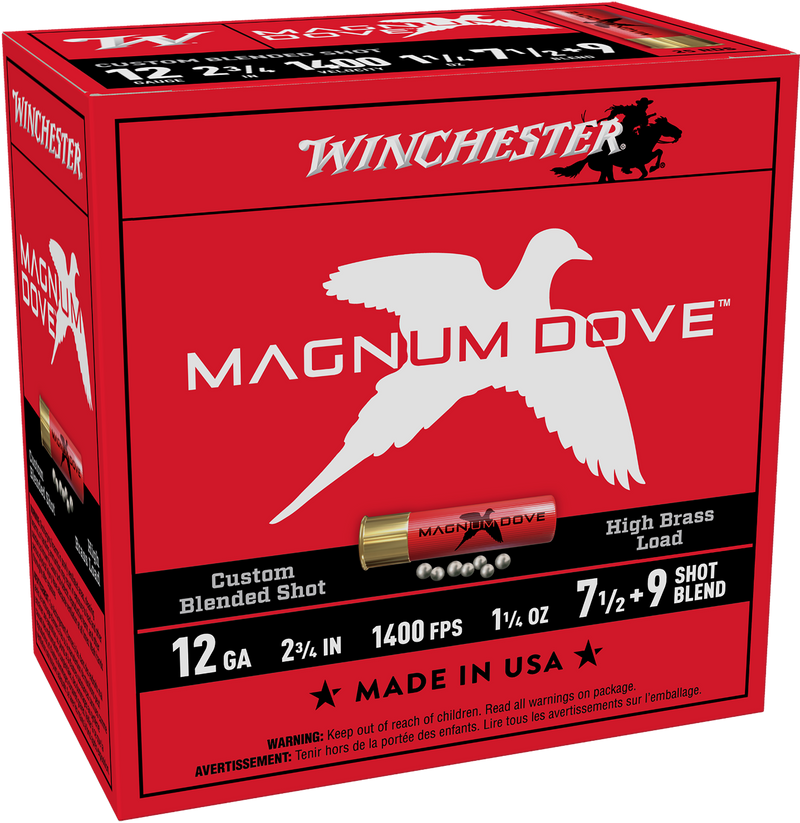 Winchester Magnum Dove is a 12 gauge shotshell loaded with 1 1/4 oz of custom blended #7.5 and #9 lead shot, designed specifically for dove hunting. The load achieves 1400 fps velocity with dense patterns optimized for consistent performance in the field. Features low brass plastic casing for reliable performance.