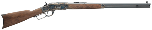 The Winchester Model 1873 Short Rifle is a lever-action rifle chambered in .45 Colt with a 20" barrel and 10+1 round capacity. Features a color case hardened steel receiver, oil-finished walnut stock, and adjustable rear/bead front sights. Weighing 7.25-7.40 lbs with a 39" overall length, this classic design is suitable for hunting and target shooting.