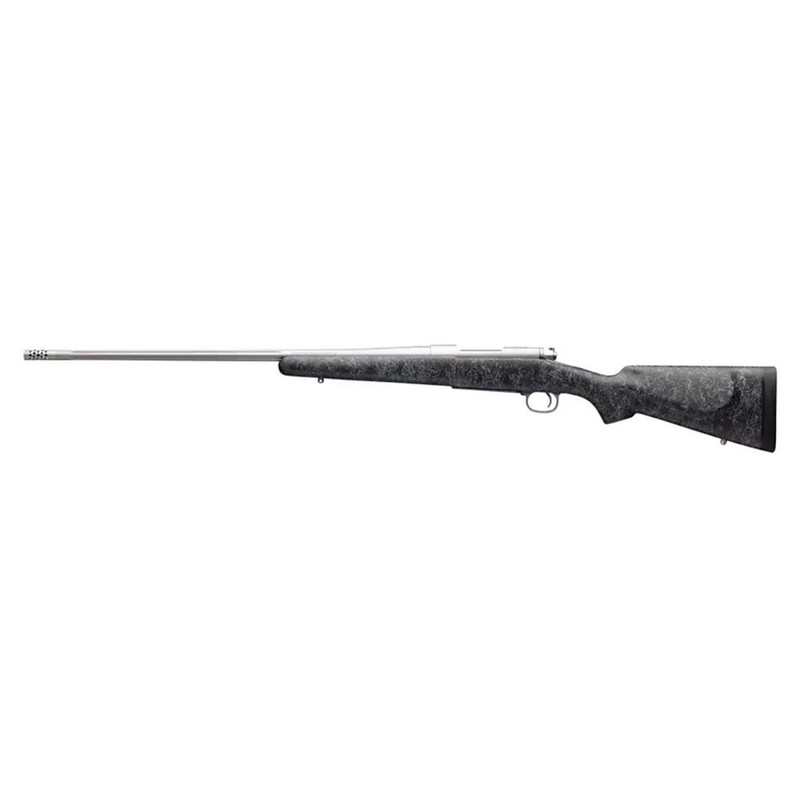 The Winchester Model 70 Extreme Weather is a bolt-action hunting rifle chambered in 6.5 PRC with a 24" fluted stainless steel barrel threaded for a muzzle brake. It features a Bell and Carlson composite stock with aluminum bedding block, MOA trigger system, and Pachmayr recoil pad. Drilled and tapped for optics, weighs 7 lbs, and has a 3+1 round capacity.