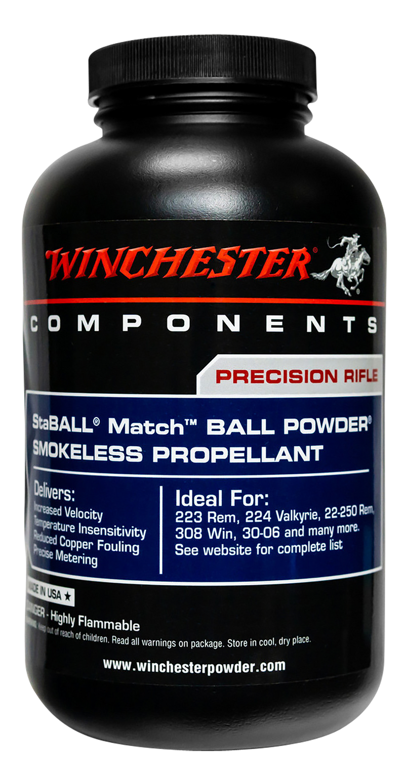 Winchester Staball Match is a temperature-insensitive double-base ball powder designed for precision rifle reloading in calibers such as .223 Remington, .224 Valkyrie, .22-250 Remington, .308 Winchester, and .30-06. The powder provides optimal loading density and precise metering for consistent velocity and pressure, making it ideal for high-BC heavy-for-caliber bullets. Each container holds 1 pound (750cc) of smokeless powder.