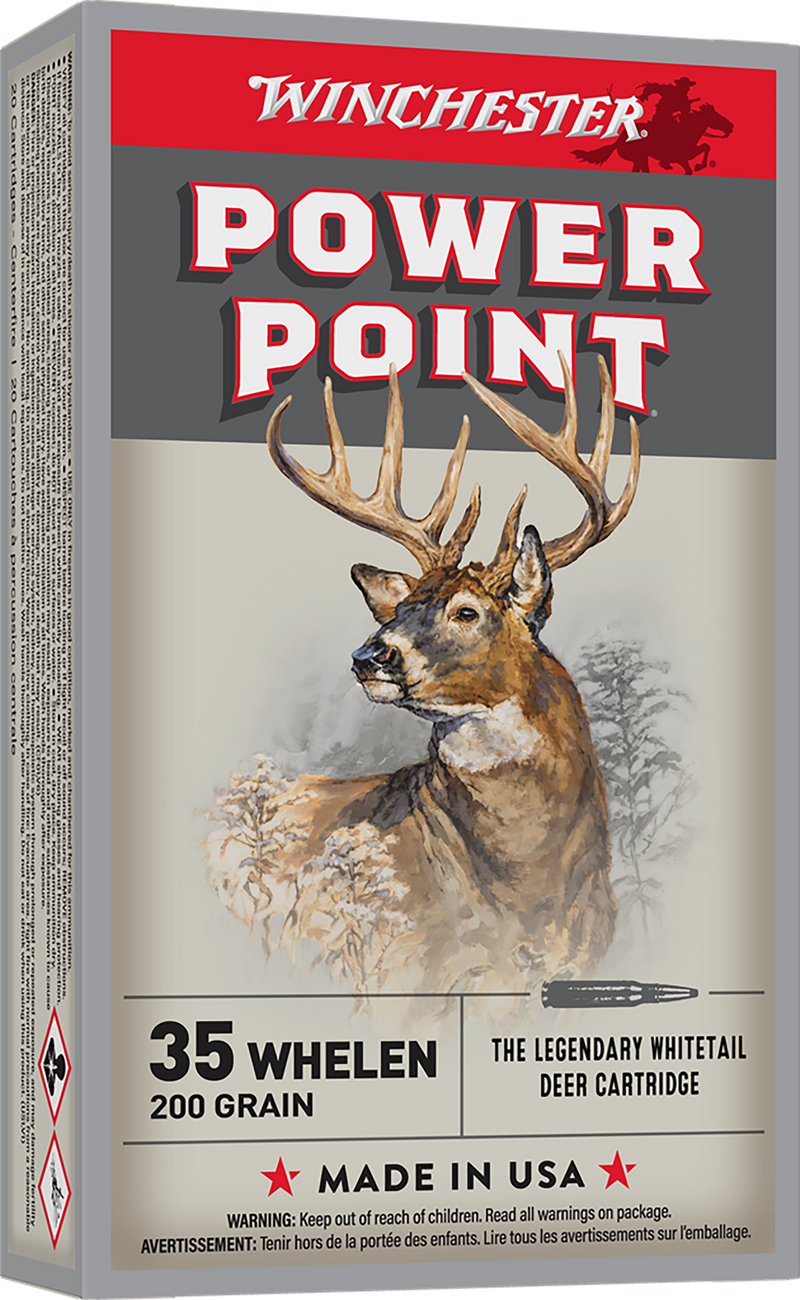Winchester Power-Point .35 Whelen centerfire rifle ammunition features a 200 grain soft point bullet delivering 2800 fps muzzle velocity and 3481 ft-lbs of energy. This time-proven hunting round is loaded in brass cases with Boxer primers and is reloadable, packaged 20 rounds per box with 10 boxes per case.