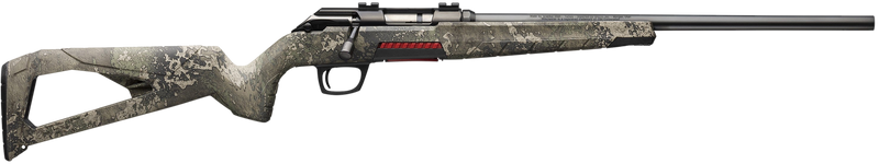 The Winchester Xpert Strata is a lightweight bolt-action rimfire rifle chambered in 17 HMR with an 18" barrel and 8+1 capacity. Features include a precision M.O.A. adjustable trigger, ambidextrous safety, threaded barrel, drilled and tapped receiver, and a molded polymer stock with TrueTimber Strata camouflage finish. Weighs 4.8 lbs with an overall length of 36.25".