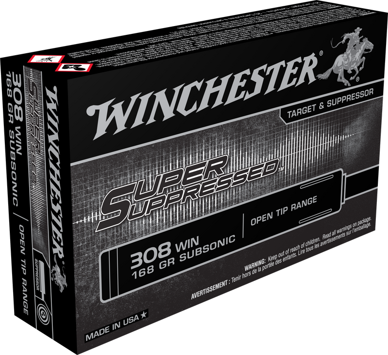 Winchester Super Suppressed .308 Winchester ammunition features 168-grain open tip range bullets loaded on brass casings, specifically designed for suppressed firearms with subsonic performance at 1060 fps. This ammunition is optimized for noise reduction, decreased fouling, and reliable accuracy in target shooting and tactical applications.