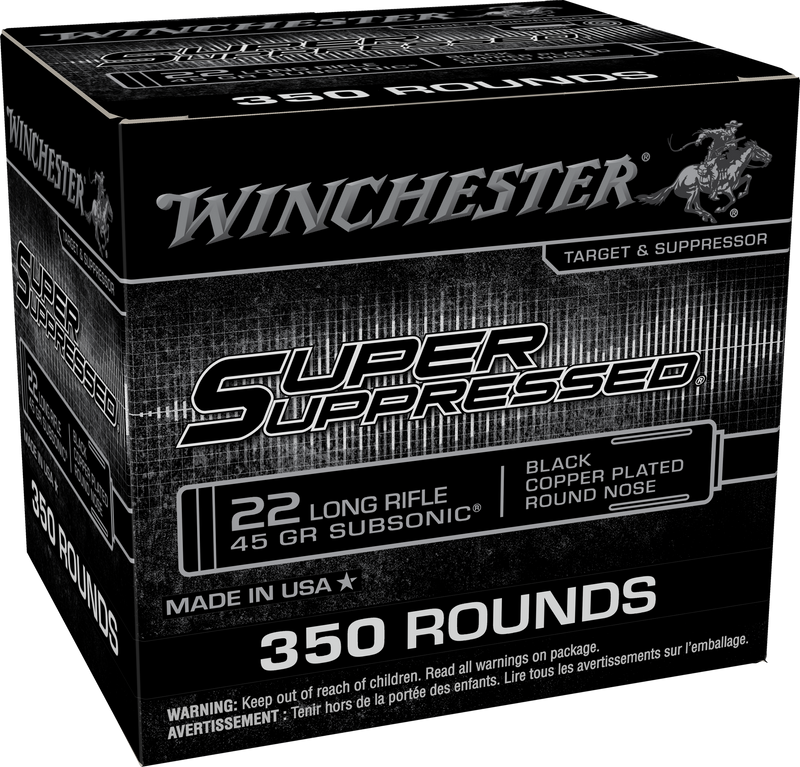 Winchester Super Suppressed .22 LR ammunition features 45 grain copper plated round nose bullets loaded to subsonic velocities (1060-1090 fps) for quiet, suppressed shooting. Engineered for reduced fouling and reliable performance in firearms equipped with suppressors, this brass-cased rimfire ammunition delivers consistent accuracy and clean operation.