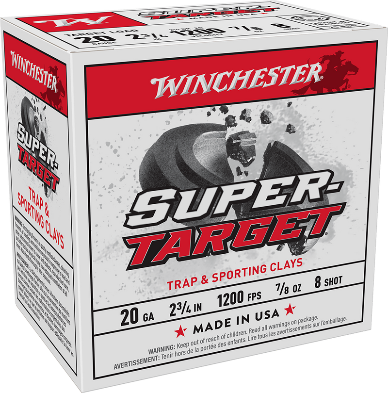 Winchester Super-Target 20 gauge 2.75-inch shotshells deliver 7/8 ounce of #8 shot at 1200 fps, engineered for target shooting, trap, skeet, and sporting clays. These loads feature clean-burning powder, a reliable Winchester primer, and a hinged wad design for reduced felt recoil and consistent patterns. Ideal for competitive clay shooting and range practice.