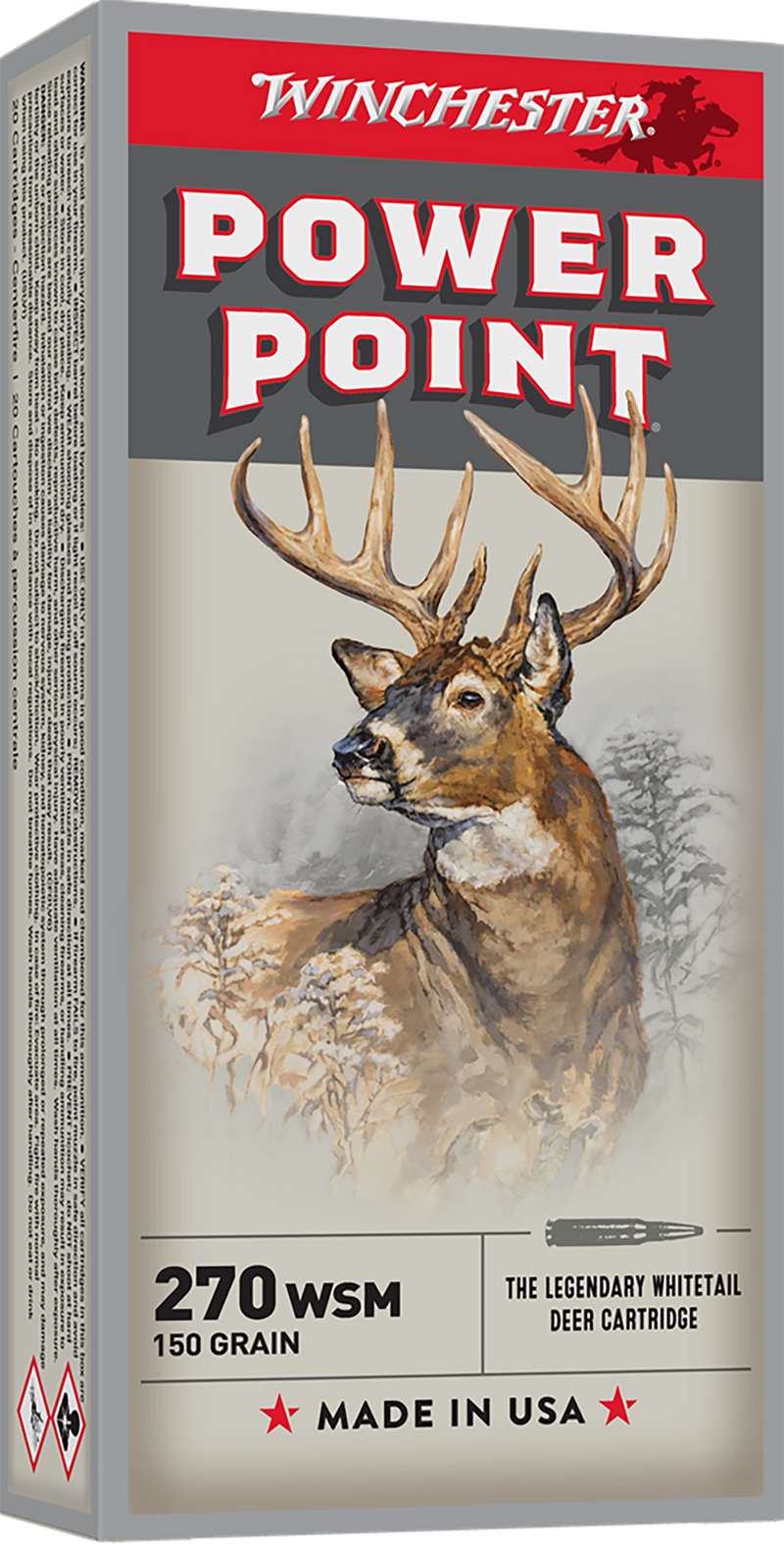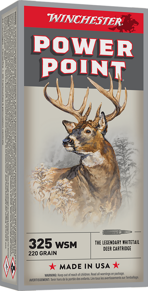 .270 WSM centerfire rifle ammunition loaded with 150 grain Power-Point bullets designed for medium to large game hunting. Delivers 3150 fps muzzle velocity and 3304 ft-lbs of energy with controlled expansion and deep penetration from quality brass casing.