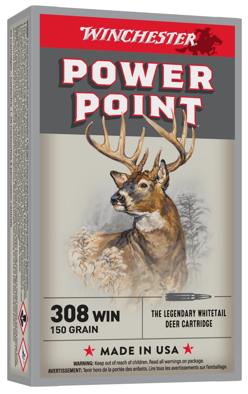 Winchester Super-X Power Point rifle ammunition in .308 Winchester features a 150-grain soft-point projectile designed for controlled expansion and deep penetration on medium to large game. The ammunition produces a muzzle velocity of 2820 fps and muzzle energy of 2648 ft-lbs, and is loaded in reloadable brass cases with Boxer primers.