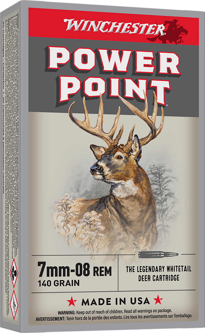 Winchester Super-X Power Point ammunition in 7mm-08 Remington with 140 grain Power-Point bullets designed for hunting medium game. This centerfire rifle ammunition delivers 2800 fps muzzle velocity and 2437 ft-lbs of energy with consistent accuracy and reliable performance.